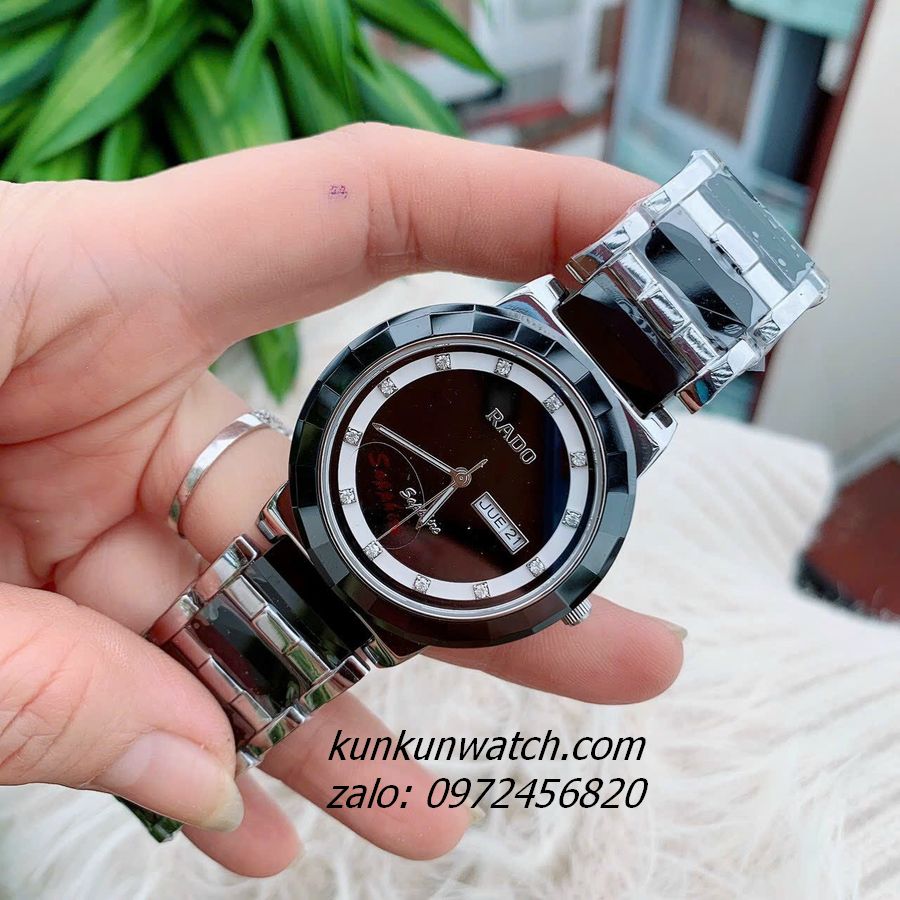 Đồng Hồ Cặp Đôi Rado mặt tròn thiết kế đính đá 12 mốc giờ, 2 lịch thứ ngày. Dây đá Ceramic đen silver sang trọng