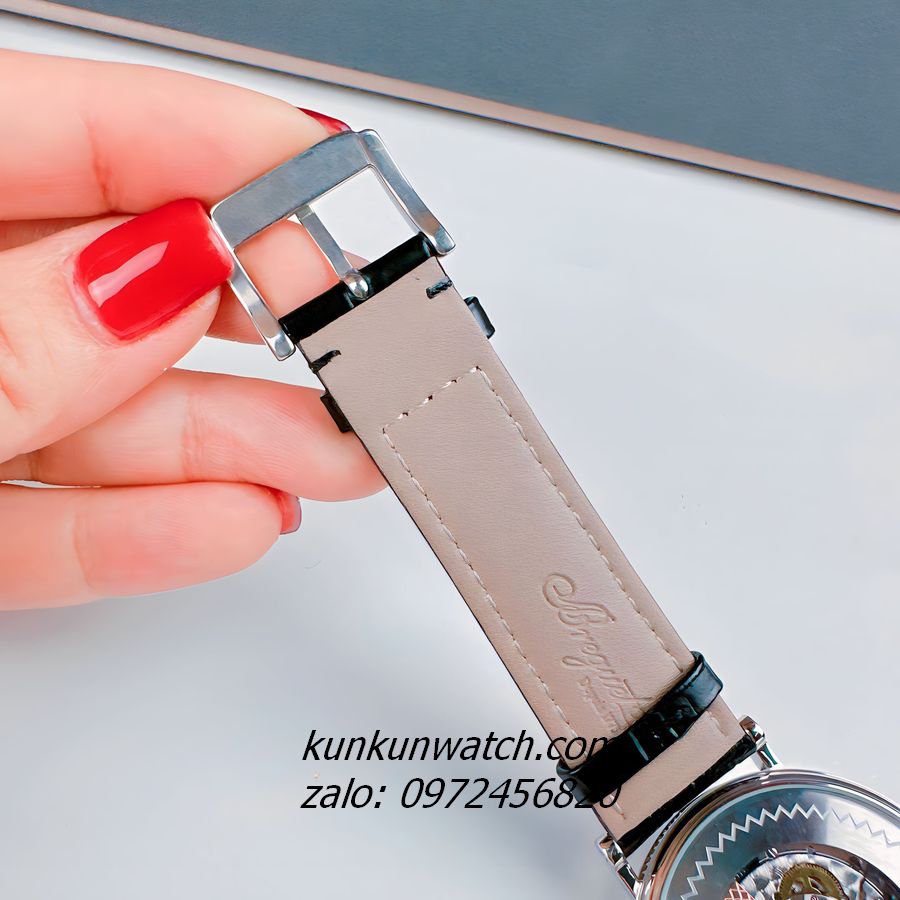 ◼️ Đồng Hồ Nam Breguet Classique 1755 Automatic lộ cơ mặt sau. Điểm số la mã 12 mốc giờ. Kim giờ phút phá cách, kim nhỏ chạy giây mặt số phụ mốc 6 giờ. Dây da khoá gài thương hiệu xịn sò
