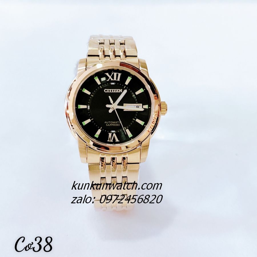 Đồng Hồ Nam Citizen Automatic 2 Lịch Điểm Số La Mã 2 Mốc Giờ Gold Mặt Đen 38mm