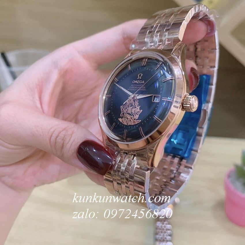 Đồng Hồ Nam Omega Automtatic thiết kế nền mặt số hình ảnh thuyền buồm biểu tượng của sự thành công, may mắn. Lịch ngày mốc 3 giờ