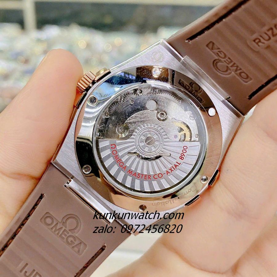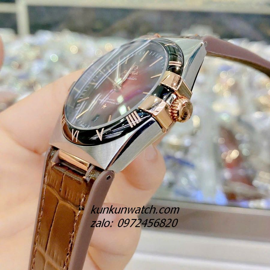 Đồng Hồ Nam Omega Constellation Automatic lộ cơ. Thiết kế mặt niềng số la mã nổi bật, nam tính. Lịch ngày mốc 6 giờ. Dây da vân đường chỉ may chắc chắn