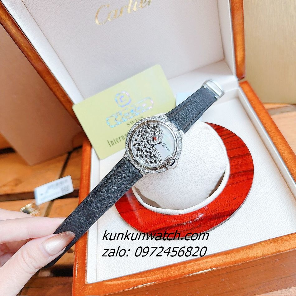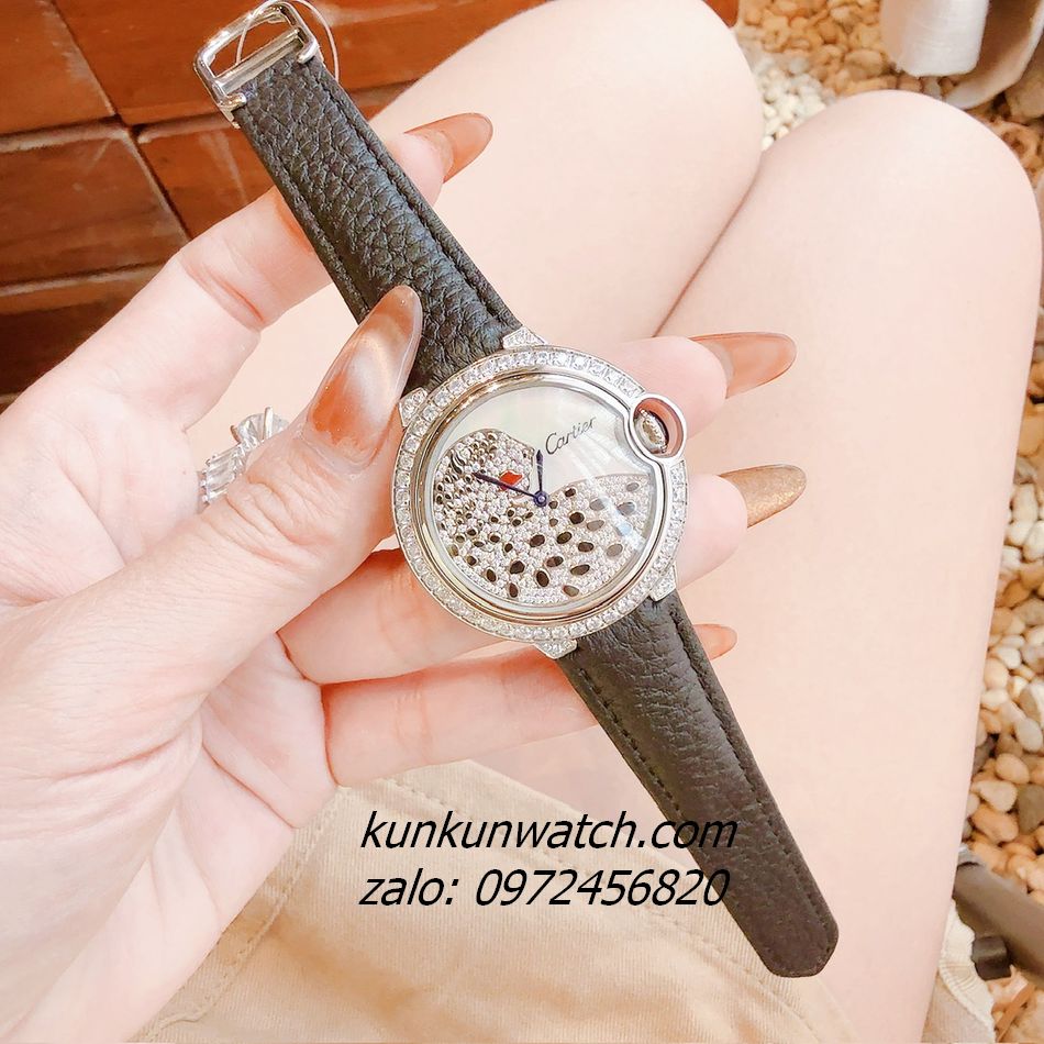 Đồng Hồ Nữ Cartier Jaguar Đính Đá Họa Tiết Báo Đốm Dây Da Đen Silver 36mm