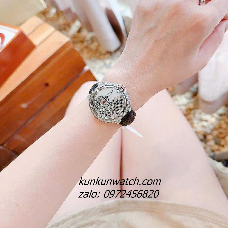 ↗️ Đồng Hồ Nữ Cartier có mặt số tròn đính đá. Nền mặt họa tiết báo đốm cá tính. Hoạt động 2 kim giờ và phút. Núm chỉnh giờ phá cách