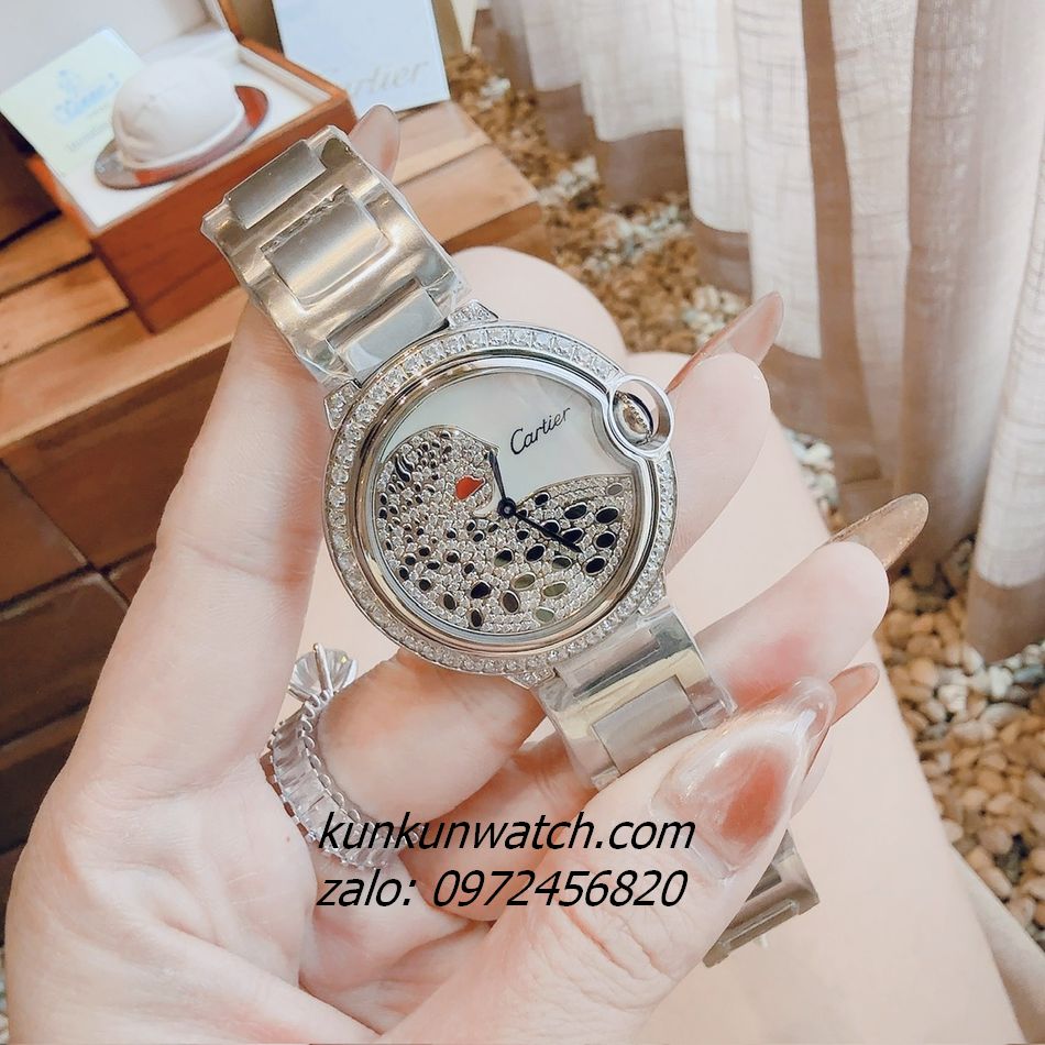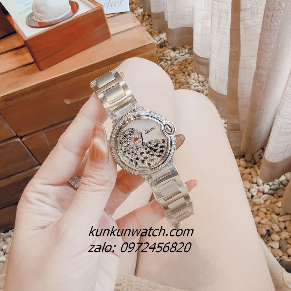 Đồng Hồ Nữ Cartier Jaguar Đính Đá Họa Tiết Báo Đốm Silver 36mm