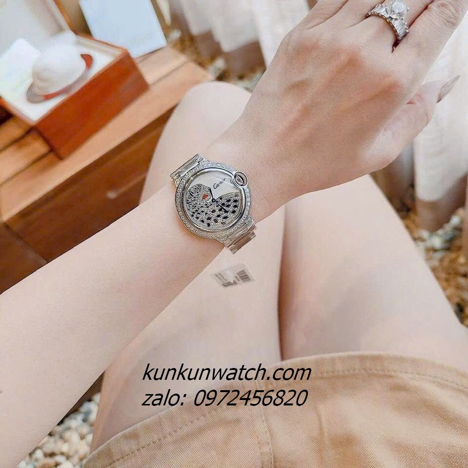 ↗️ Đồng Hồ Nữ Cartier có mặt số tròn đính đá. Nền mặt họa tiết báo đốm cá tính. Hoạt động 2 kim giờ và phút. Núm chỉnh giờ phá cách