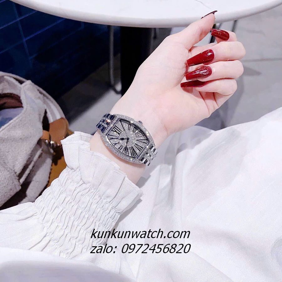 ◾ Đồng Hồ Nữ Chopard phiên bản Frank Muller với thiết kế đặc trưng mặt ovan đính Full đá, điểm số la mã các mốc giờ . Dây đeo thép không rỉ đính đá phá cách