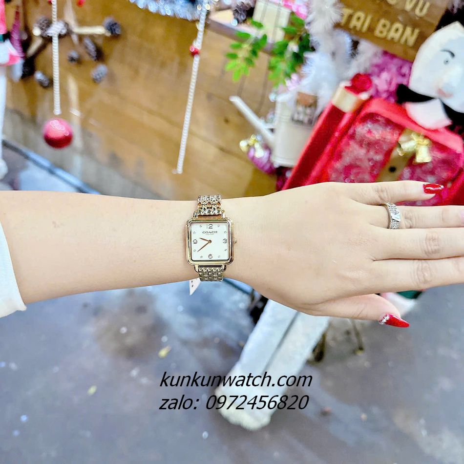 ◾ Đồng Hồ Nữ Coach Cass 14504495 Vỏ Gold Mặt Vuông. Điểm Số 4 mốc giờ, điểm pha lê 8 mốc giờ còn lại. 2 kim hoạt động