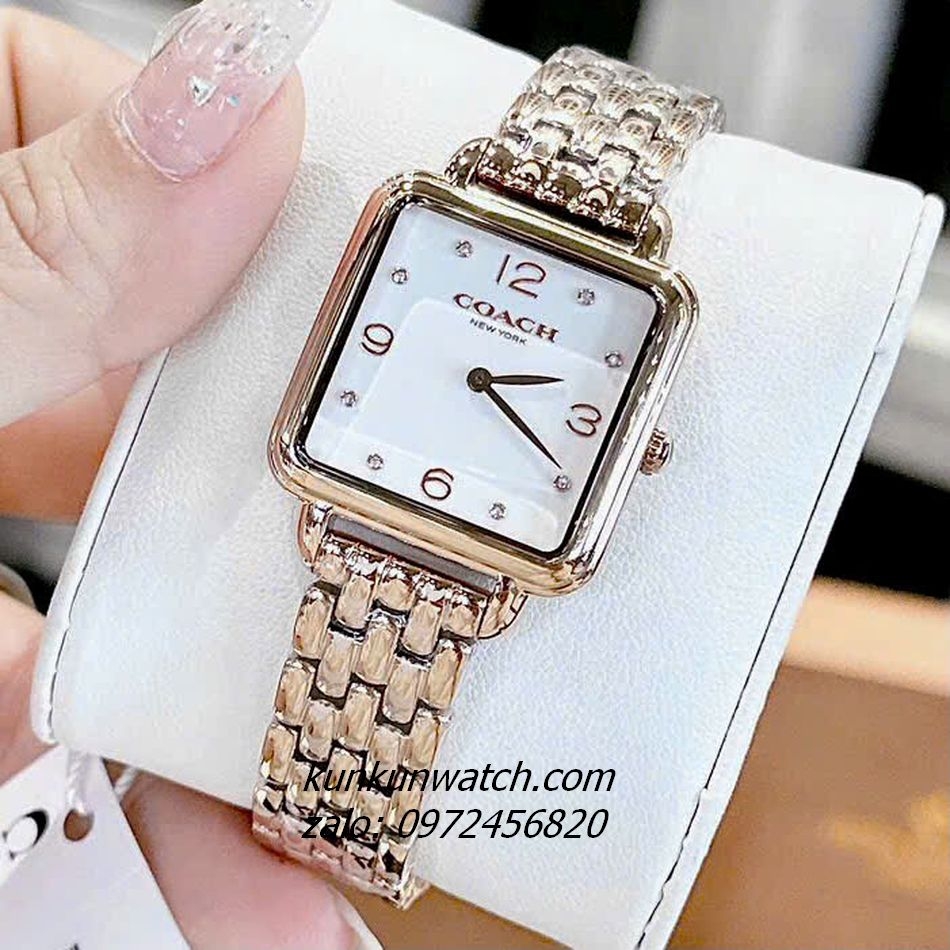 ◾ Đồng Hồ Nữ Coach Cass 14504532 Vỏ Rose Gold Mặt Vuông. Điểm Số 4 mốc giờ, điểm pha lê 8 mốc giờ còn lại. 2 kim hoạt động