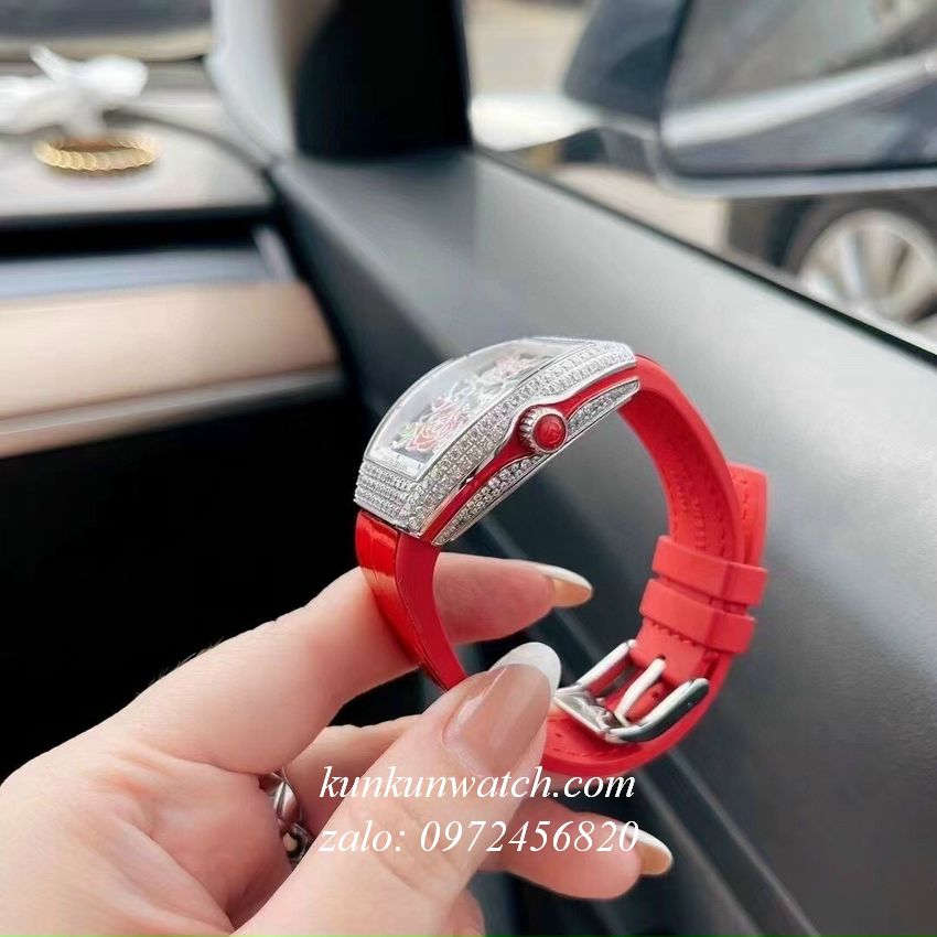 Đồng Hồ Nữ Franck Muller V32 - ABF Nền Lộ Máy, Hoa Văn - Dây Đỏ - 32 x 42mm