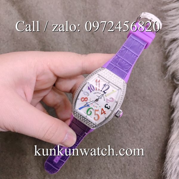 Đồng Hồ Nữ Franck Muler Vanguard V32 - đính hạt quanh viền - số chỉ giờ nhiều màu sắc sinh dộng, cá tính - dây cao su bọc da đem đến cảm giác không gò bó nhưng vẫn sang trọng, thanh lịch.