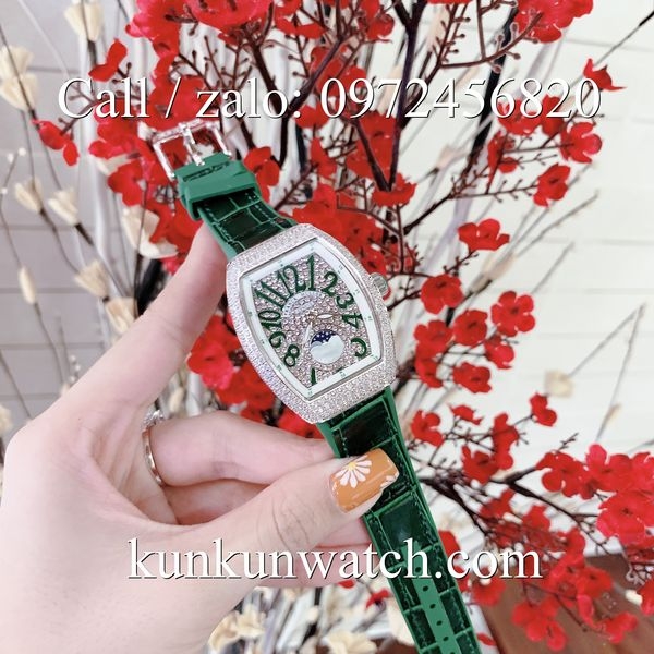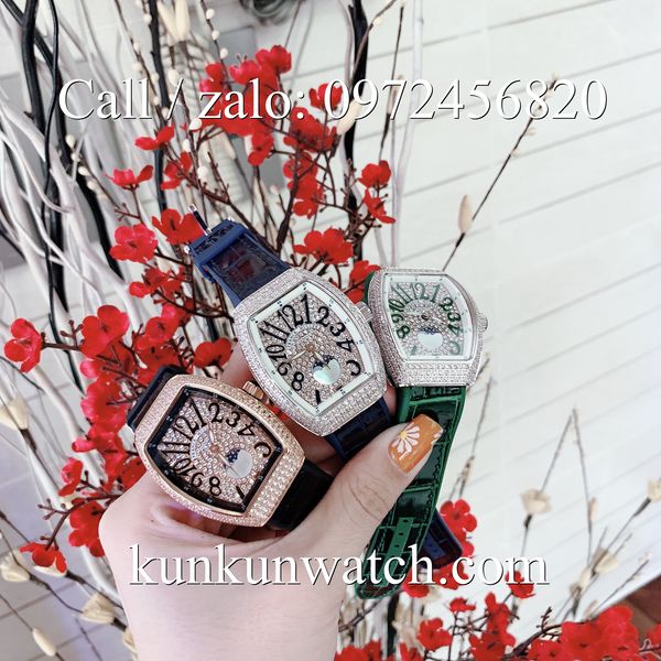 Đồng Hồ Nữ Franck Muler Vanguard V32 - đính Full hạt quanh viền và nền mặt số - lịch ngày đêm vị trí 6H - dây cao su bọc da đem đến cảm giác không gò bó nhưng vẫn sang trọng, thanh lịch.