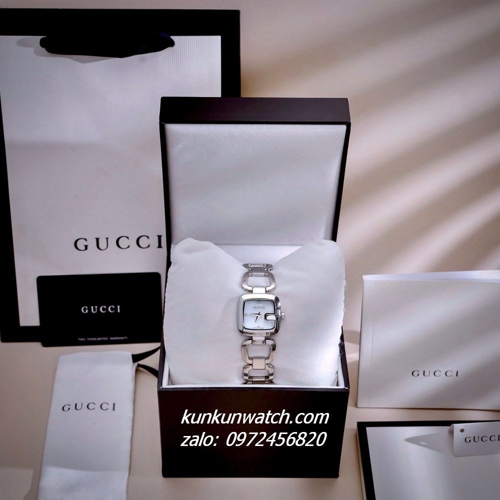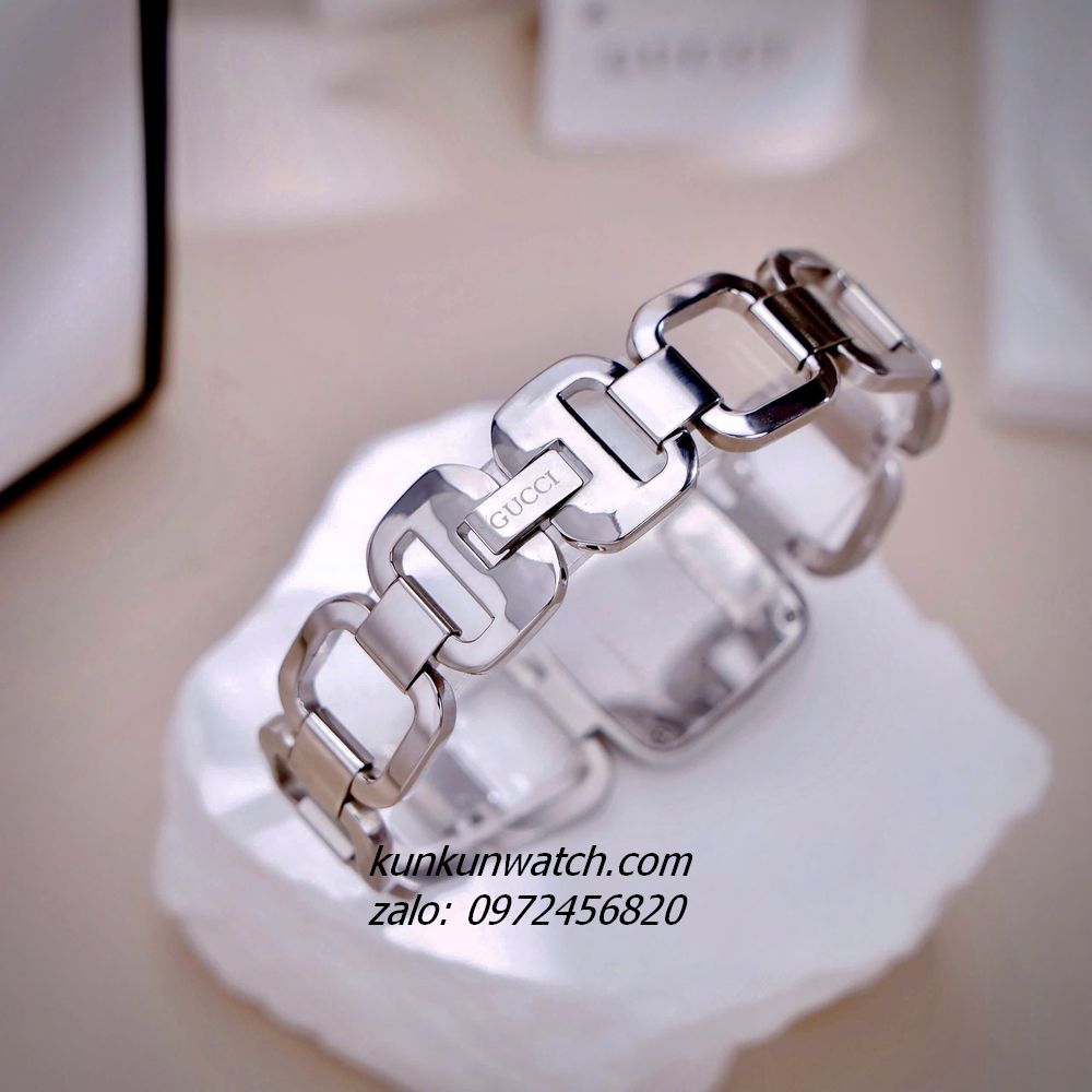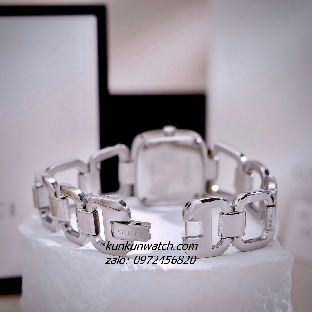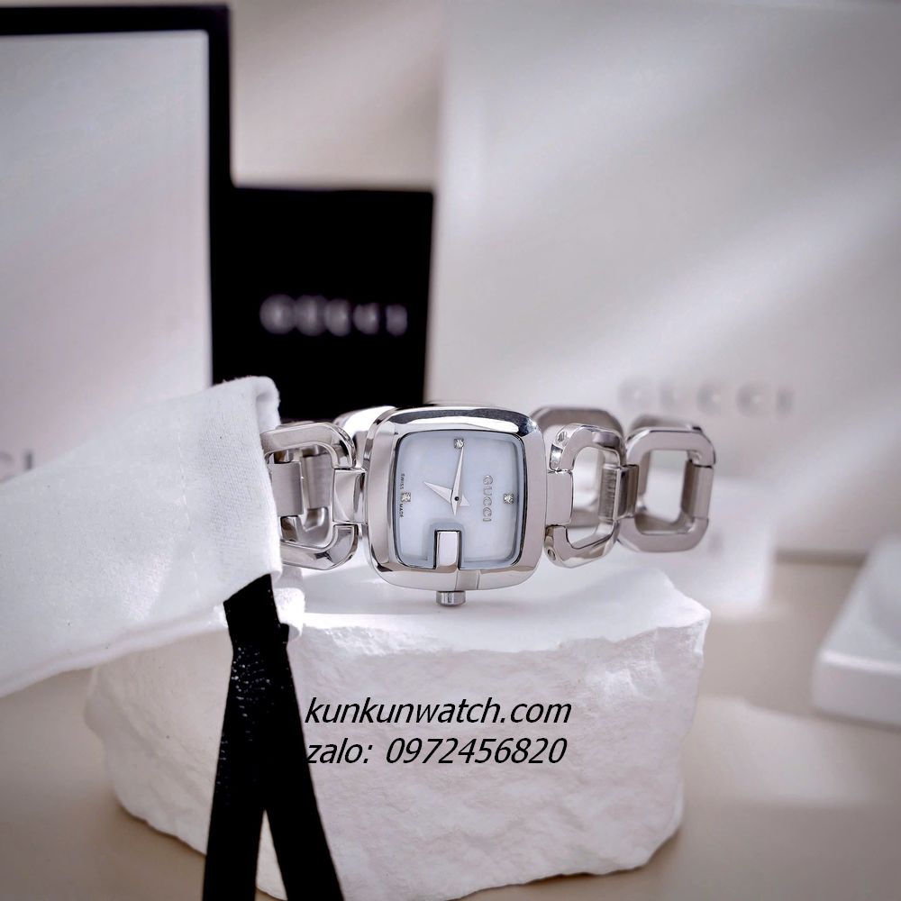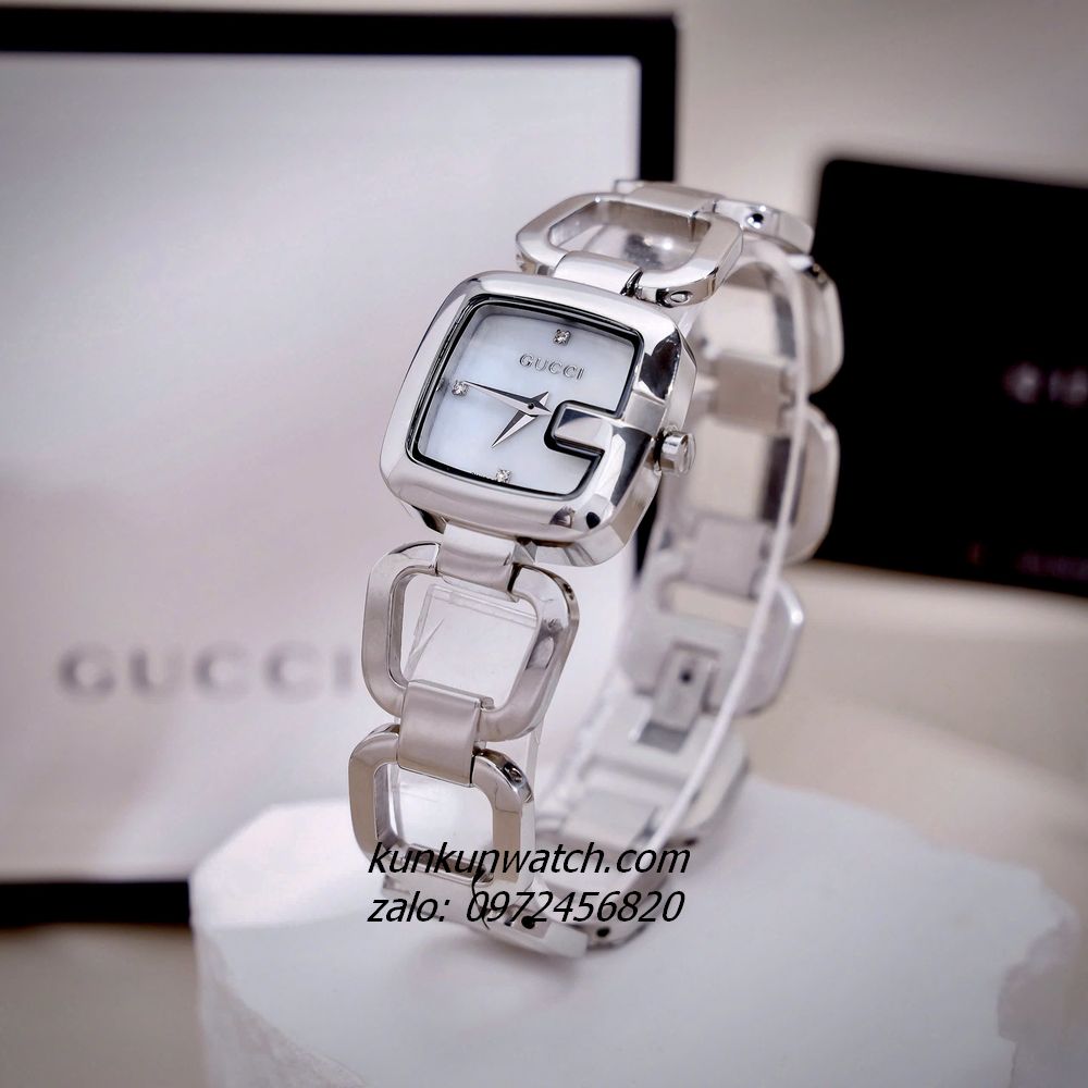 ◼️ Chiếc đồng hồ với kiểu mặt số dáng G-gucci đặc trưng thương hiệu, nền mặt xà cừ trắng sang trọng. Đính đá 3 mốc giờ, vỏ Silver. Dây đeo dáng lắc tay, mắc xích vuông cực thông thoáng, cá tính