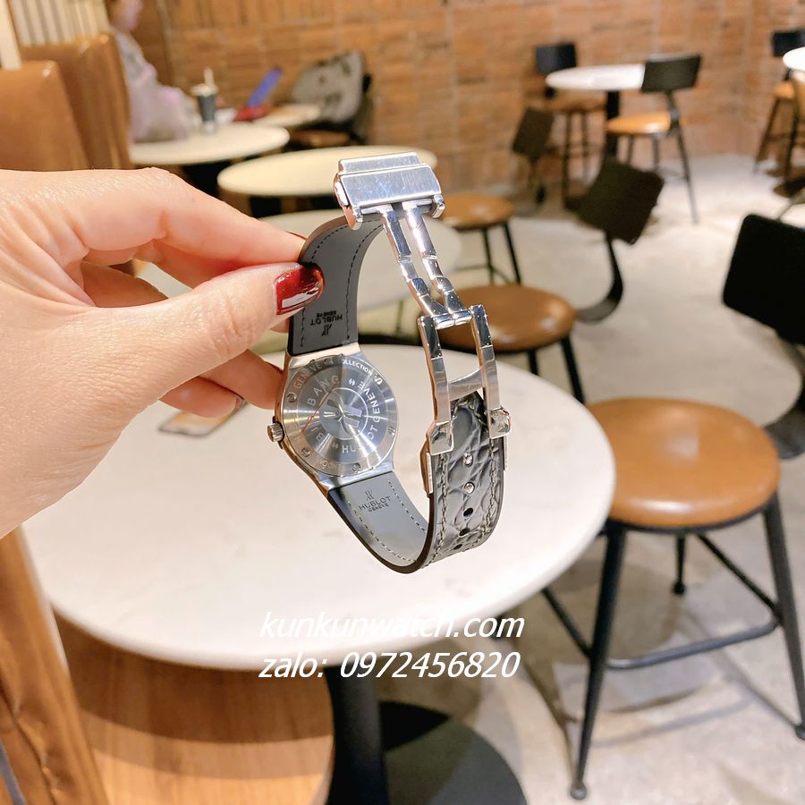 Đồng Hồ Nữ Hublot Classic Fusion đính đá vỏ, full nền mặt số, viền đá vuông kết hợp 6 đinh ốc. Điểm vạch 11 mốc giờ
