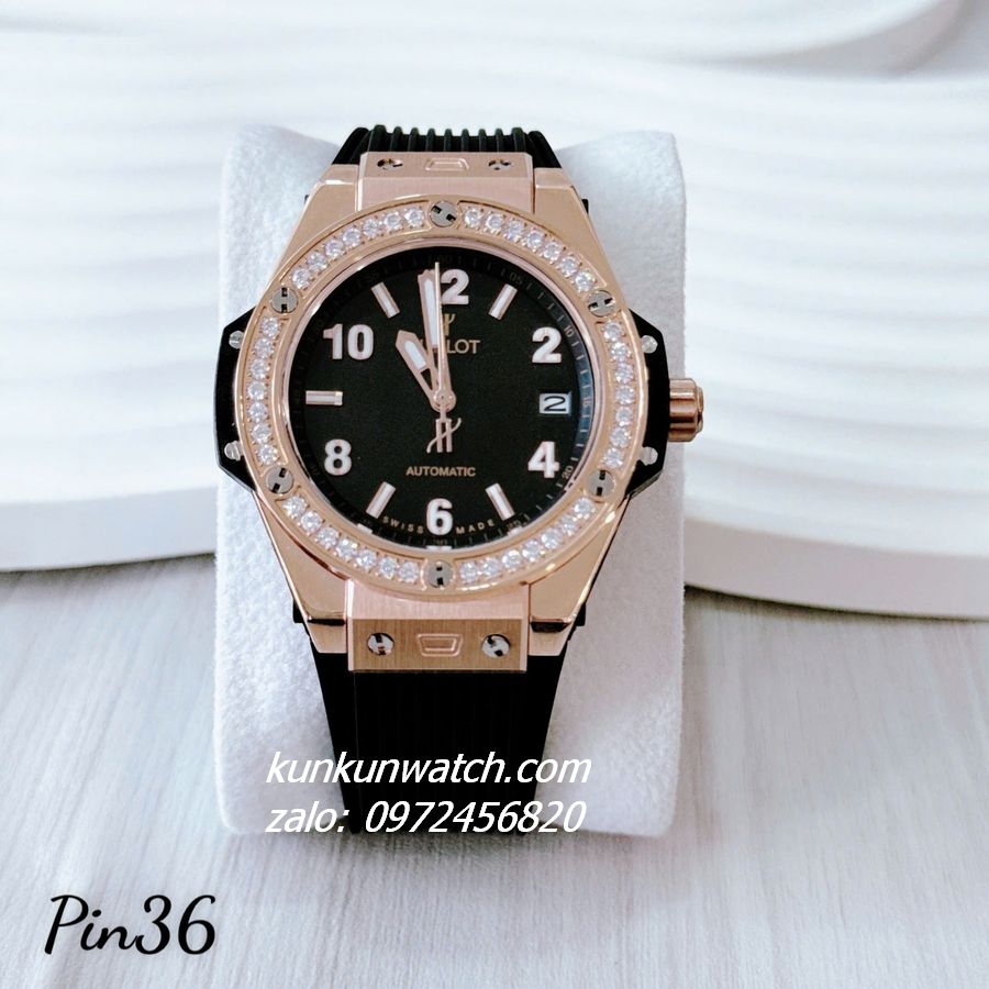 Đồng Hồ Nữ Hublot Đính Đá Lịch Ngày Dây Silicone Đen Rose Gold 36mm