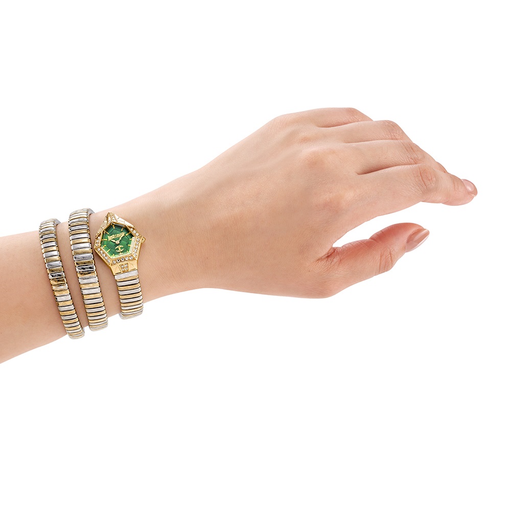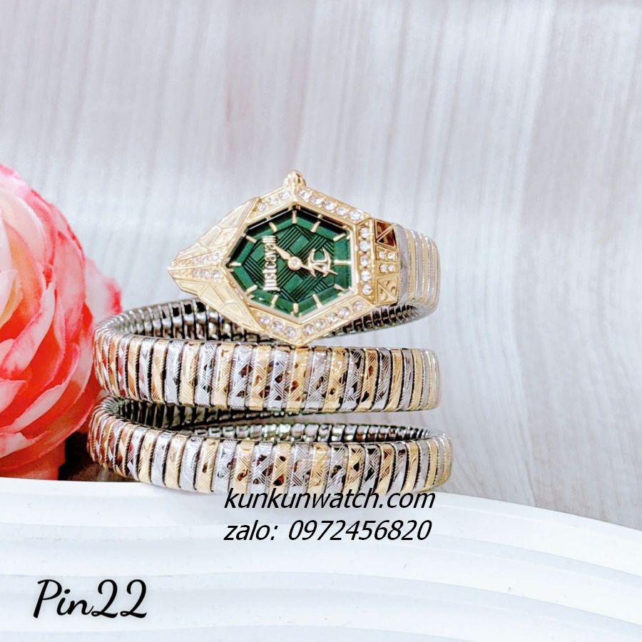 Đồng Hồ Nữ Just Cavalli JC1L304M0065 dáng rắn quấn theo tay, mặt số đầu rắn góc cạnh, đính viền đá chắc chắn, thu hút. Điểm vạch 12 mốc giờ, nền mặt vân