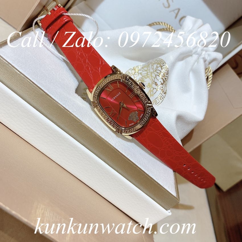Đồng Hồ Nữ Versace Couture điểm số la mã tại các mốc 3, 9 và 12H kết hợp logo Medusa nổi vị trí 6H, 2 kim giờ và phút, nền mặt đỏ. Dây da vân tông đỏ quyến rũ, thu hút