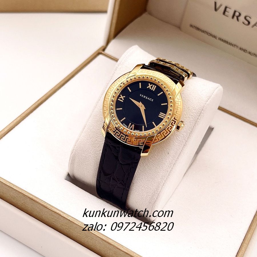 Đồng Hồ Nữ Versace DV-25 thiết kế vỏ bầu mix họa tiết Greca, viền chấm kim loại. Điểm số la mã 4 mốc giờ, 2 kim hoạt động