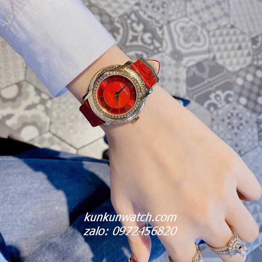 Đồng Hồ Nữ Versace DV-25 thiết kế vỏ bầu mix họa tiết Greca, viền chấm kim loại. Điểm số la mã 4 mốc giờ, 2 kim hoạt động