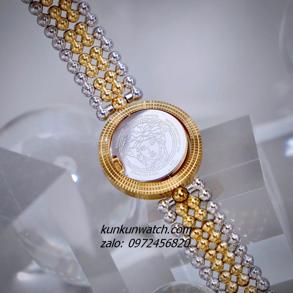 Đồng Hồ Nữ Versace Eon Pour Femmes thiết kế mặt xoay 360 độ, có thể đeo thay đổi 2 kiểu mặt số niềng tên thương hiệu và niềng khía