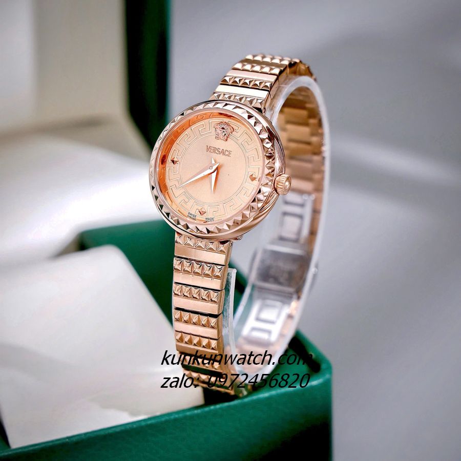 Chiếc Đồng Hồ Nữ Versace Greca Goddess nhỏ nhắn, phá cách với họa tiết ở vỏ và thân dây đeo. Họa tiết Greca vành trong nền mặt số trắng tươi mới, điểm chấm kim loại gold 3 mốc giờ, icon medusa gold mốc 12 giờ