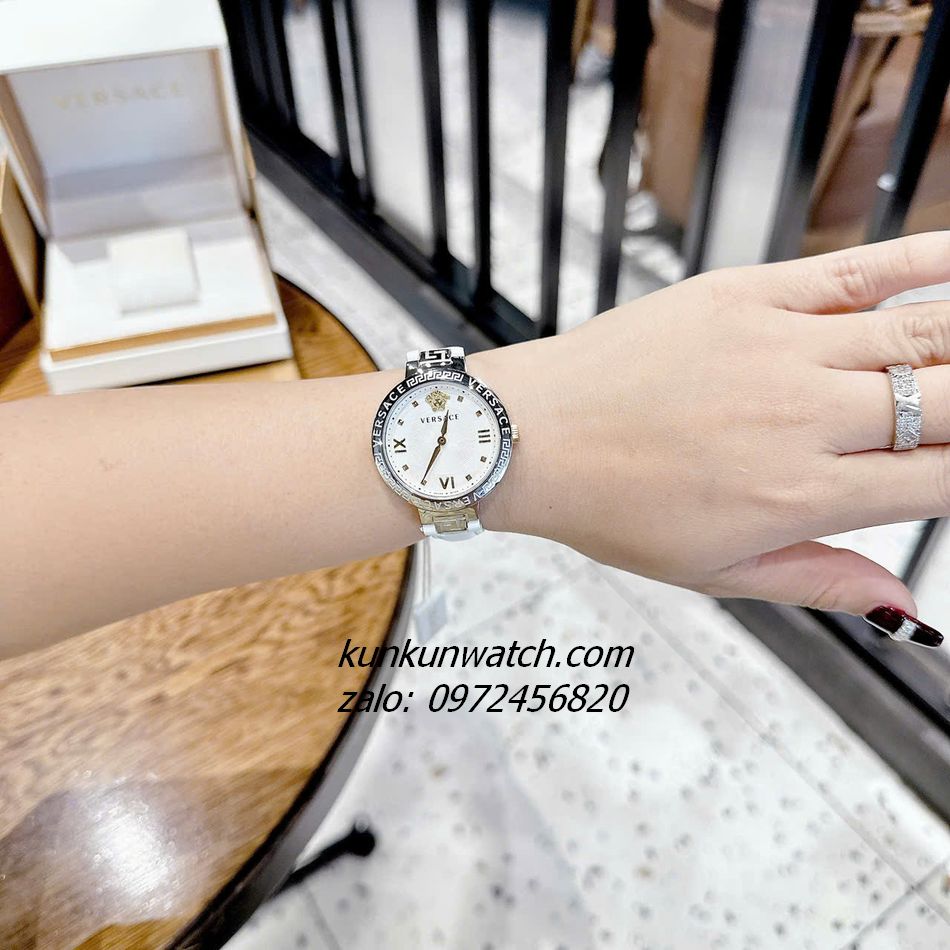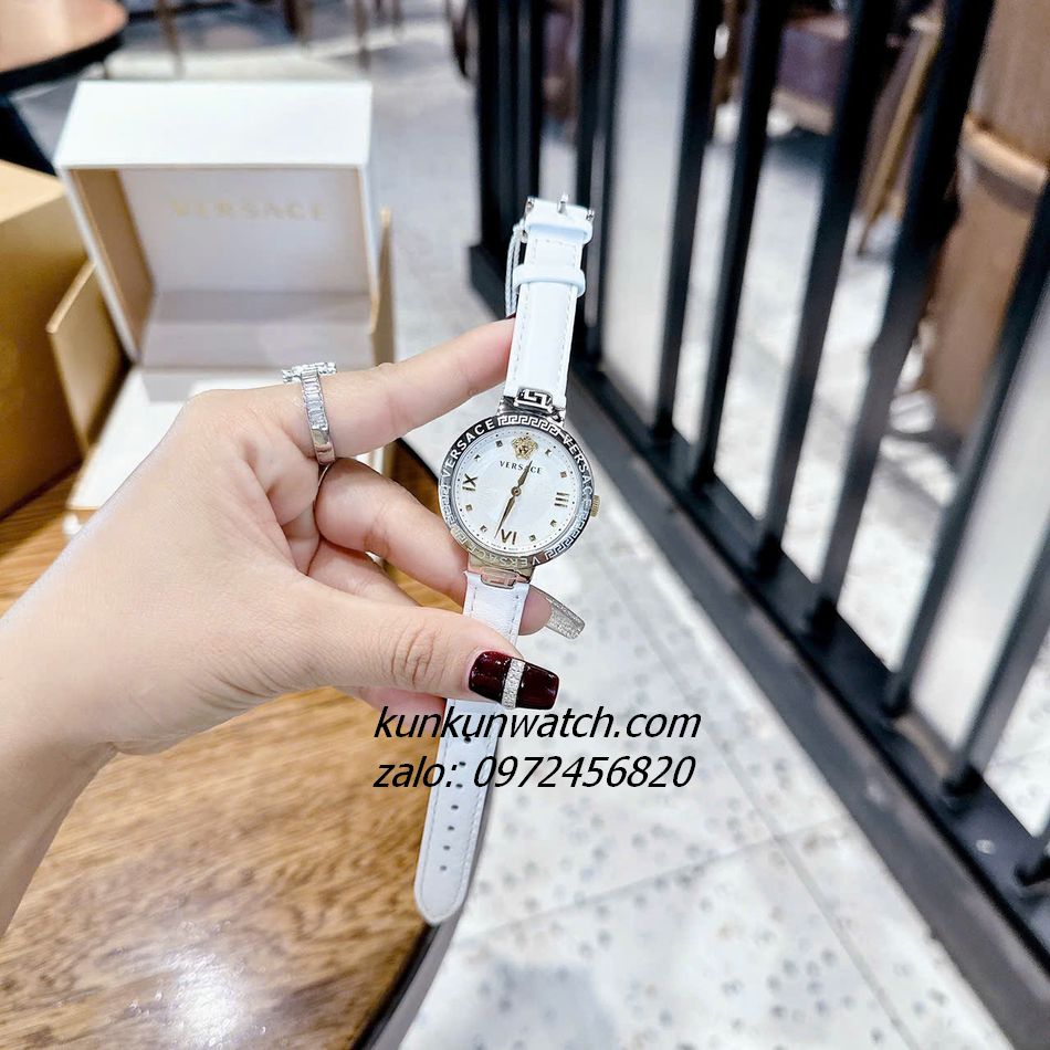 Đồng Hồ Nữ Versace Greca Strap có vỏ khảm họa tiết Greca cùng tên thương hiệu. Icon medusa 3D nổi màu gold trên nền mặt tia tại mốc 12H. Điểm số la mã 3 mốc 3H - 6H - 9H, 2 kim hoạt động. Dây da tông trắng thanh lịch