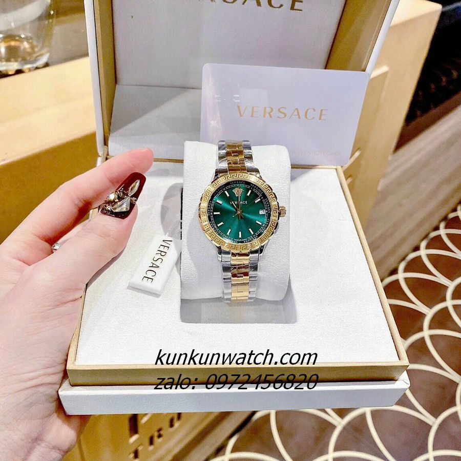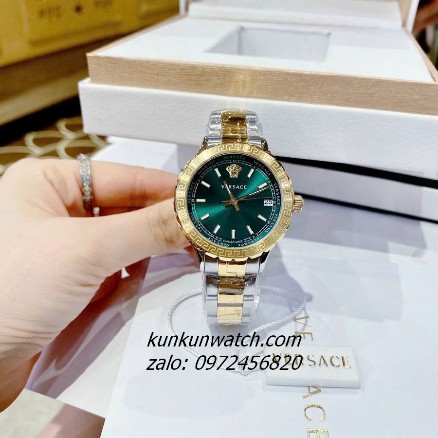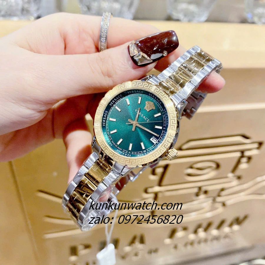 Đồng Hồ Nữ Versace Hellenyium có vỏ niềng răng cưa mix họa tiết greca. Logo Medusa head nổi bật tại mốc 12H, lịch ngày mốc 3H