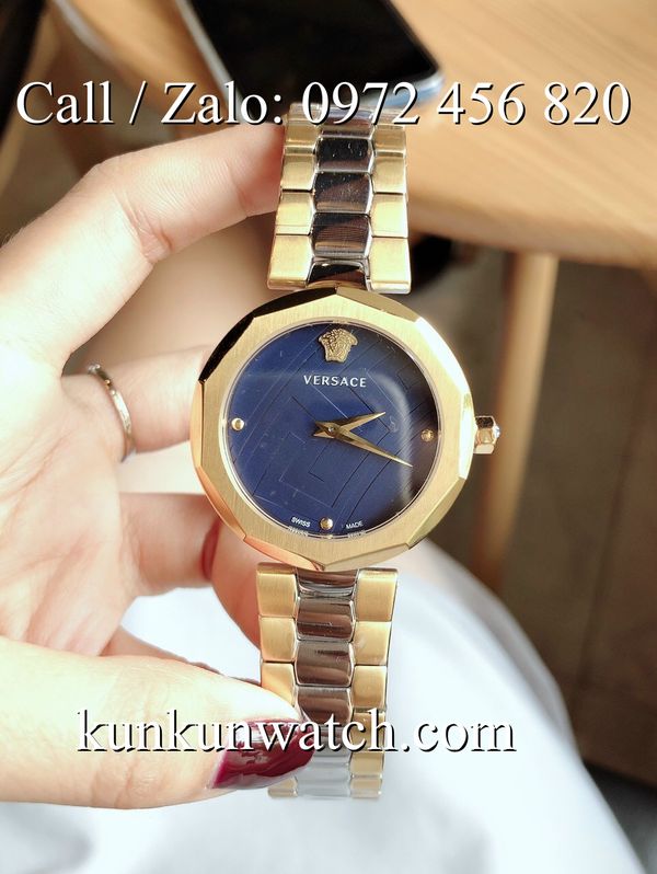 Đồng Hồ Nữ Versace Idyia với mặt tròn góc cạnh cá tính, nền xanh hoa văn. Biểu tượng Medusa nổi tại vị trí 12H. Dây đeo thép không rỉ sang trọng