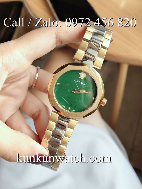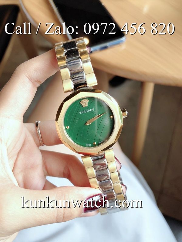 Đồng Hồ Nữ Versace Idyia với mặt tròn góc cạnh cá tính, nền xanh mộc hoa văn. Biểu tượng Medusa nổi tại vị trí 12H. Dây đeo thép không rỉ sang trọng