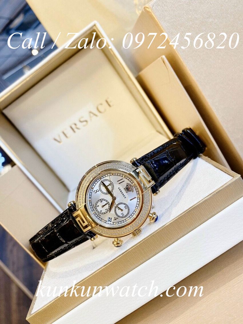 Đồng Hồ Nữ Versace Reve Chrono Mother thiết kế điểm giờ phá cách. Dây da đen bóng cao cấp sang trọng