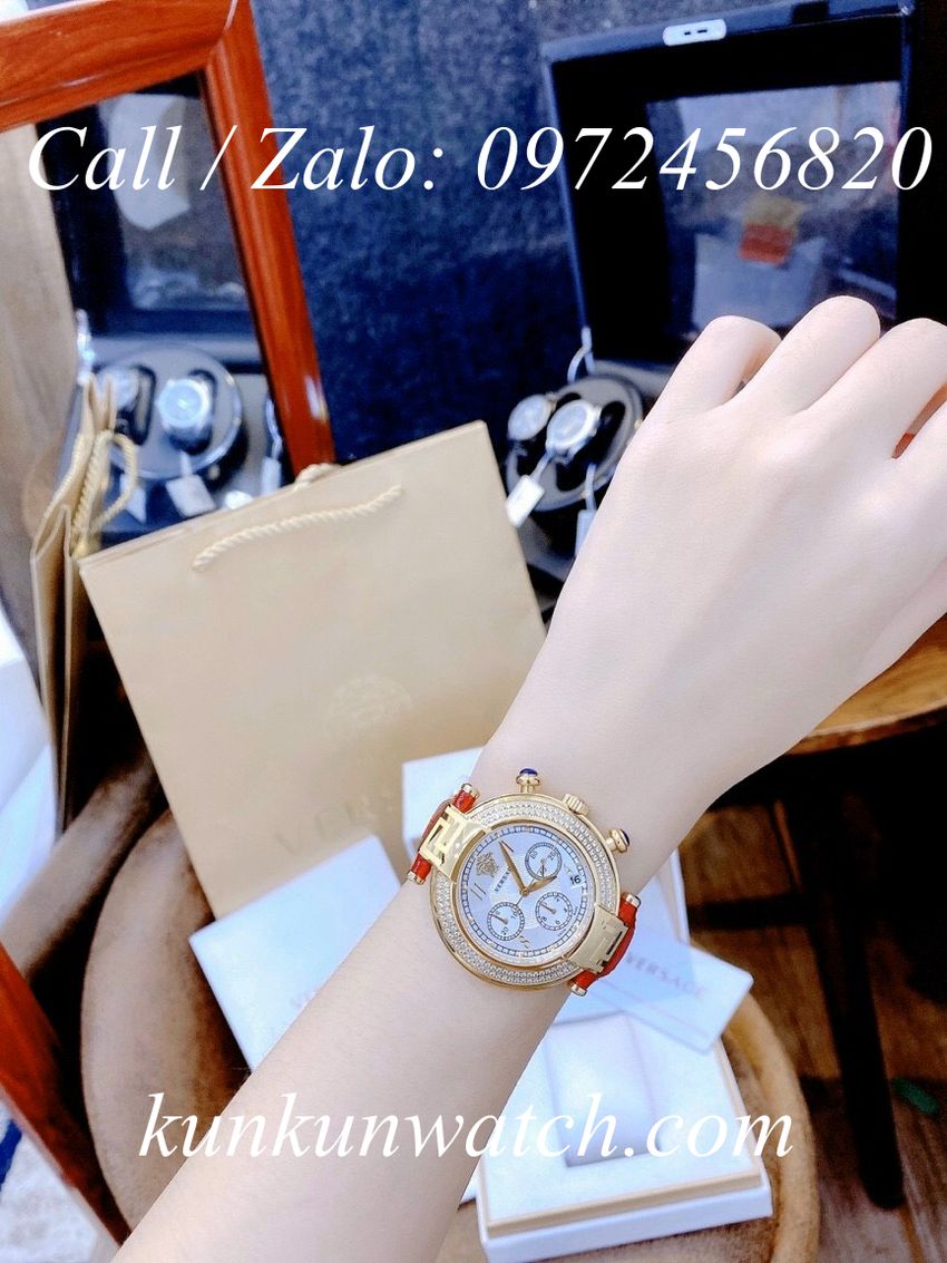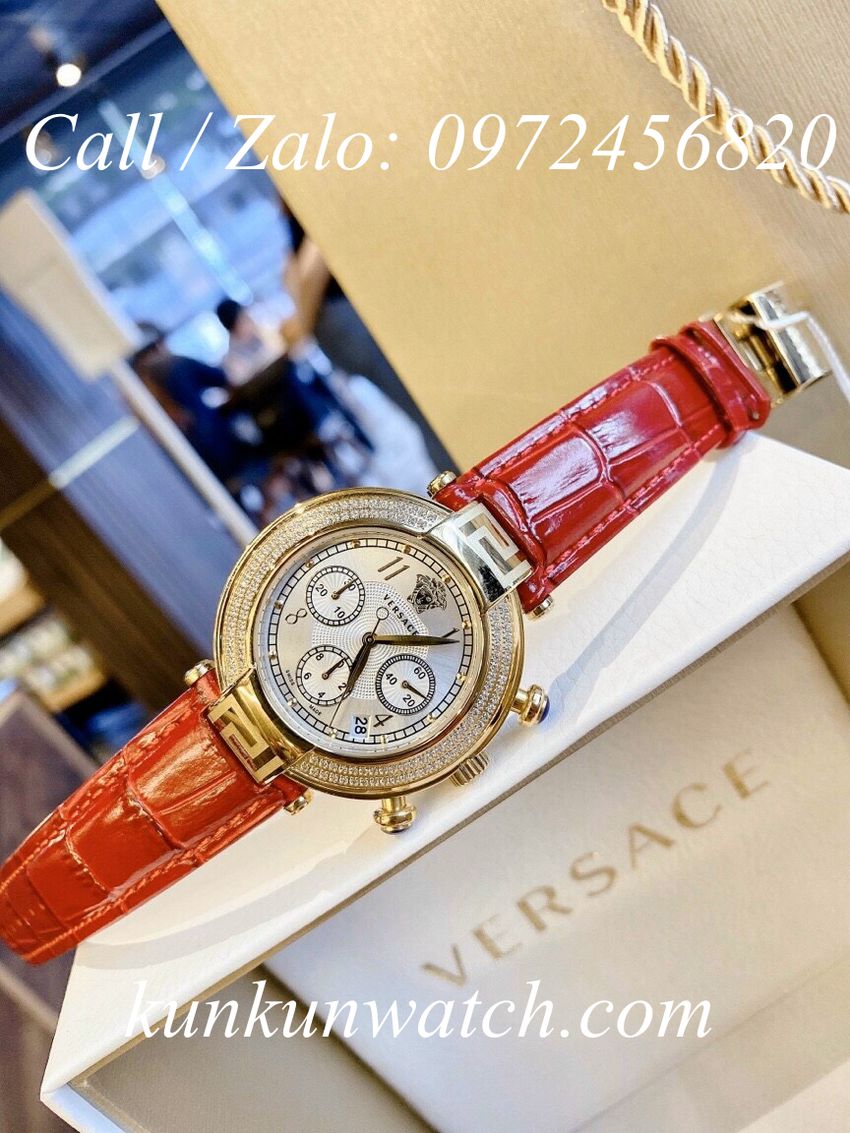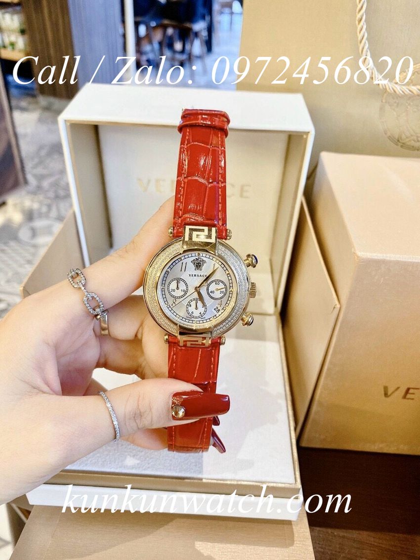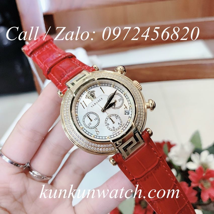 Đồng Hồ Nữ Versace Reve Chrono Mother thiết kế điểm giờ phá cách. Dây da đỏ bóng cao cấp sang trọng