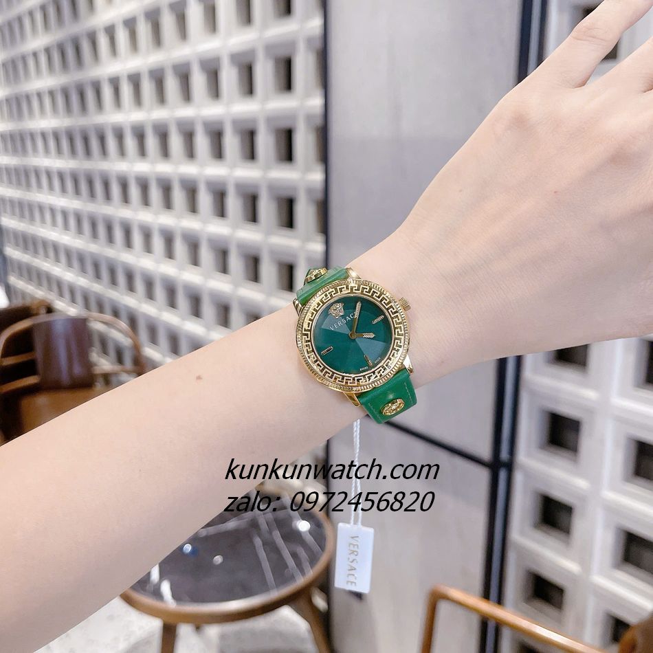 Đồng Hồ Nữ Versace V-Tribute vỏ niềng khía mix họa tiết greca ấn tượng, mặt 36mm phù hợp nữ vòng tay trên 15cm. Icon medusa 3D gold nổi tại vị trí trung tâm.