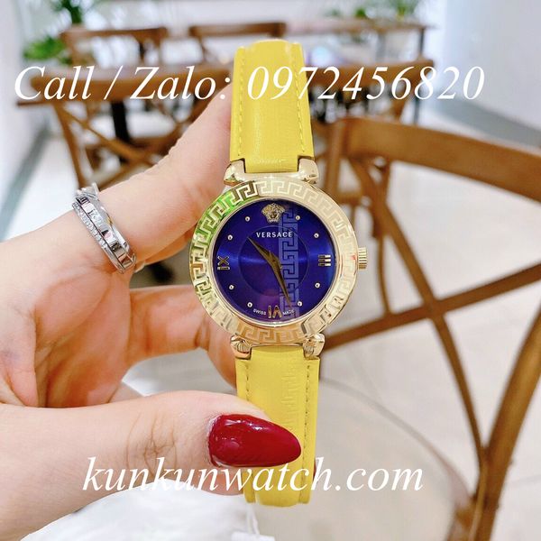 Đồng Hồ Nữ Versace Daphnis dây da khóa bướm tông vàng trẻ trung. Logo Medusa vị trí 12H cùng số la mã, 2 kim tông vàng nổi bật trên nền mặt số xanh phá cách