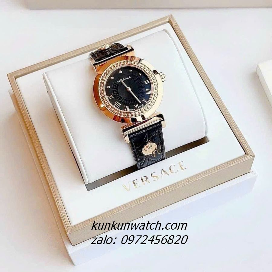 Đồng Hồ Nữ Versace Vanity có vỏ viền chấm kim loại, điểm số la mã ở nữa mặt số từ 3H đến 9H, điểm chấm từ 9H đến 2H. Nền mặt họa tiết Greca, 2 kim hoạt động