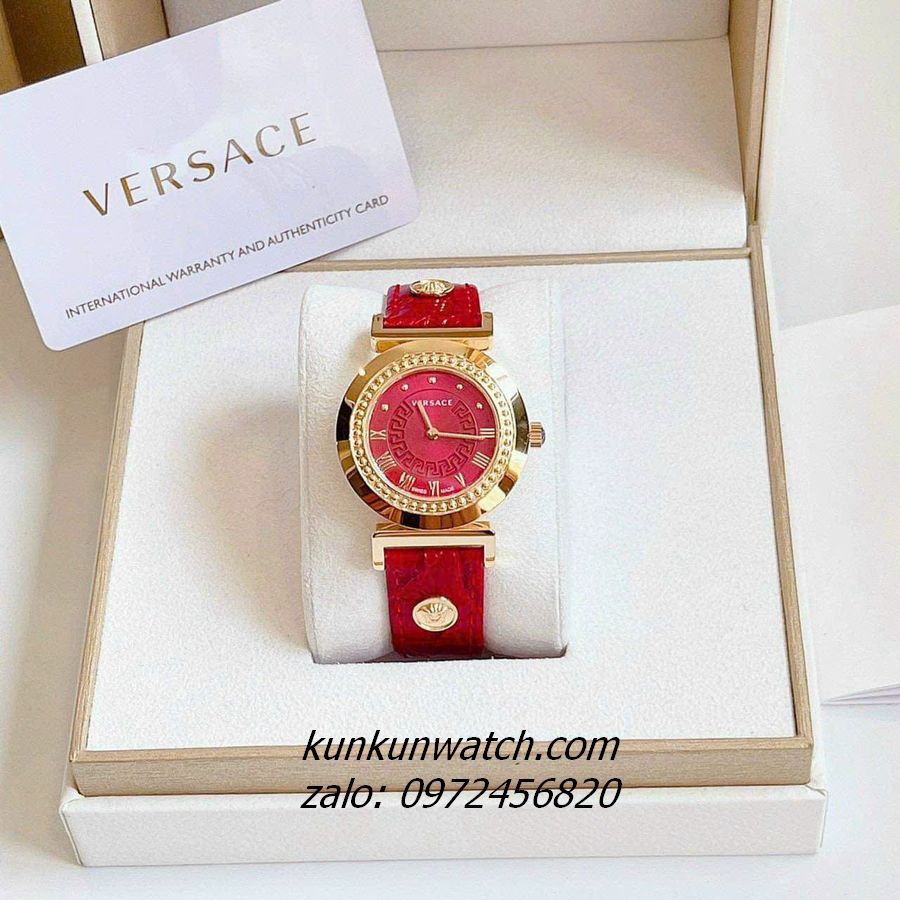 Đồng Hồ Nữ Versace Vanity có vỏ viền chấm kim loại, điểm số la mã ở nữa mặt số từ 3H đến 9H, điểm chấm từ 9H đến 2H. Nền mặt họa tiết Greca, 2 kim hoạt động