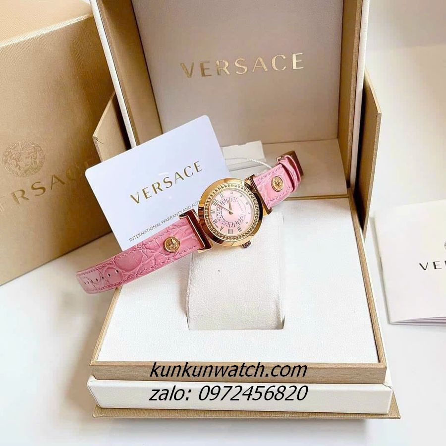 Đồng Hồ Nữ Versace Vanity có vỏ viền chấm kim loại, điểm số la mã ở nữa mặt số từ 3H đến 9H, điểm chấm từ 9H đến 2H. Nền mặt họa tiết Greca, 2 kim hoạt động