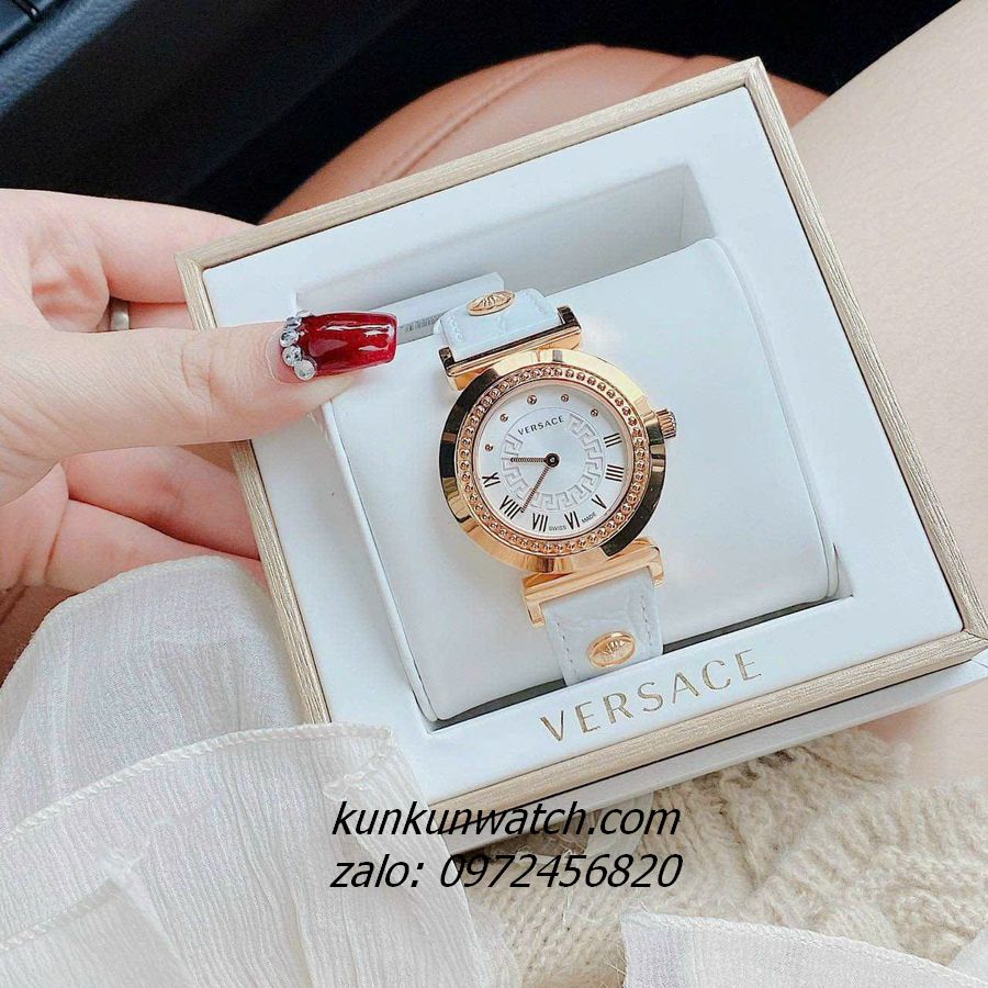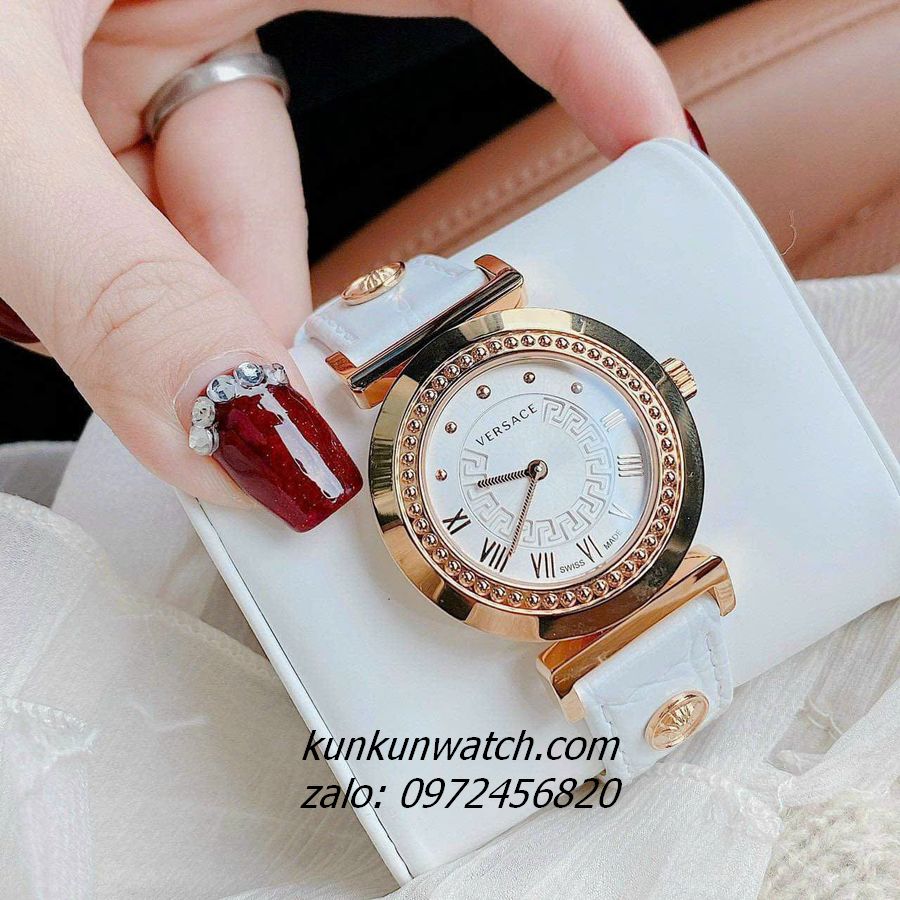 Đồng Hồ Nữ Versace Vanity có vỏ viền chấm kim loại, điểm số la mã ở nữa mặt số từ 3H đến 9H, điểm chấm từ 9H đến 2H. Nền mặt họa tiết Greca, 2 kim hoạt động