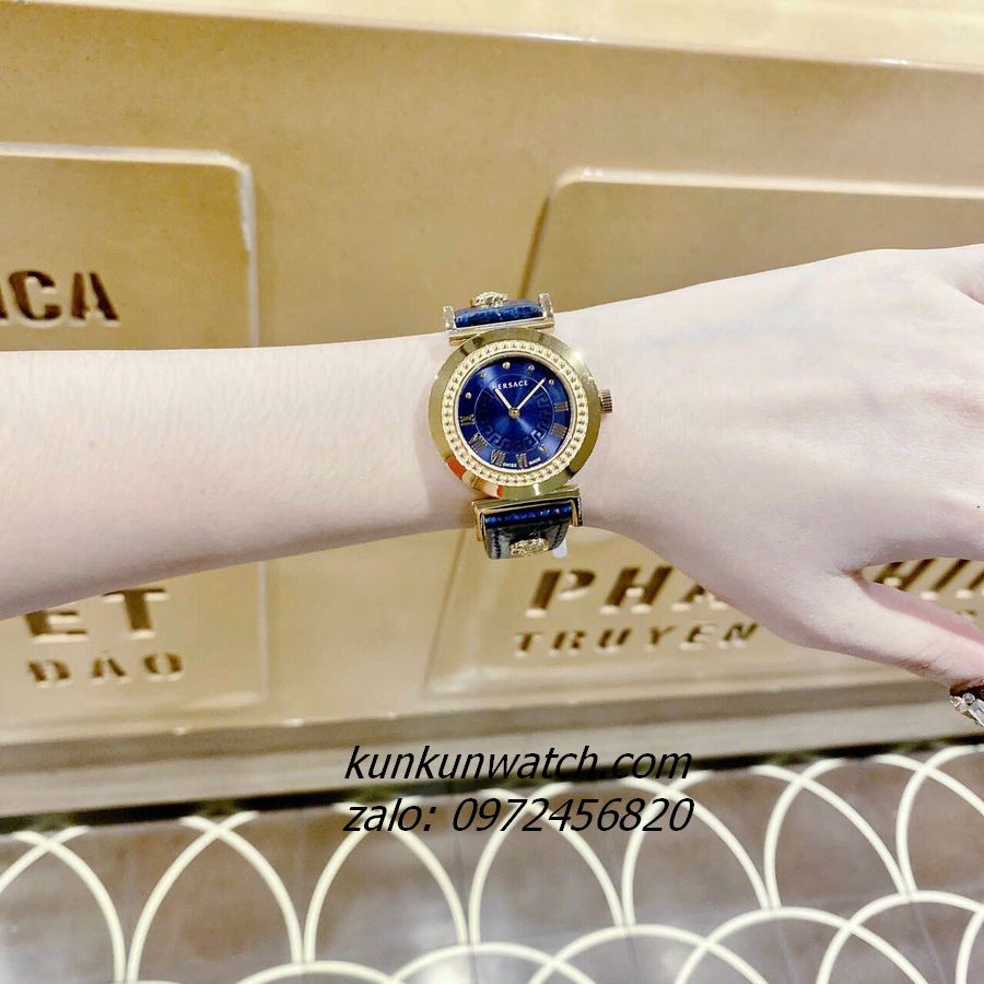 Đồng Hồ Nữ Versace Vanity có vỏ viền chấm kim loại, điểm số la mã ở nữa mặt số từ 3H đến 9H, điểm chấm từ 9H đến 2H. Nền mặt họa tiết Greca, 2 kim hoạt động