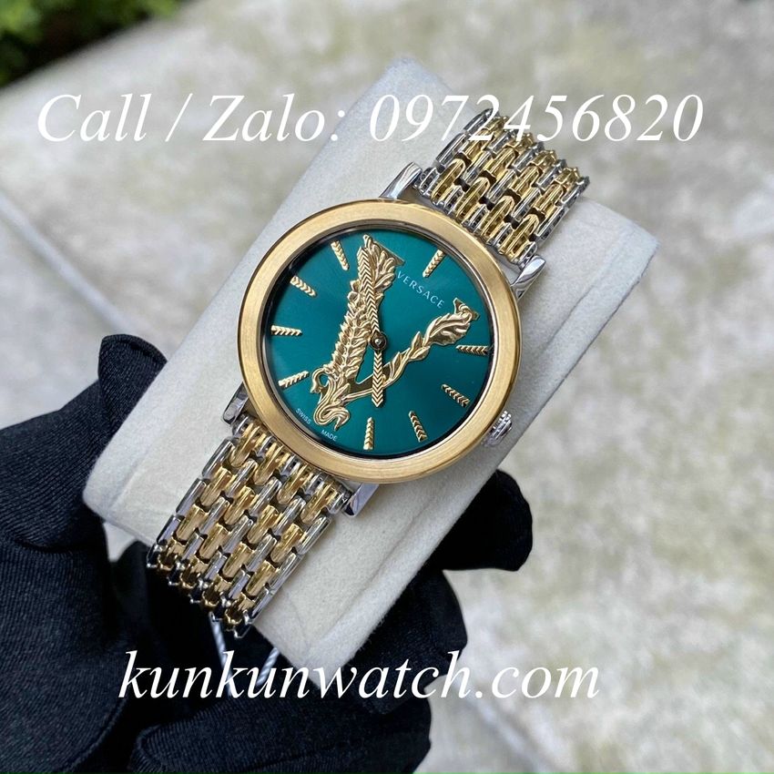 Đồng Hồ Nữ Versace Virtus nền mặt số chữ V tinh xảo, tỉ mỉ được lấy cảm hứng từ thiết kế baroque đầy tính thẩm mỹ. Kim, vạch số điểm giờ cách điệu, thu hút. Dây đeo thép không rỉ sang trọng